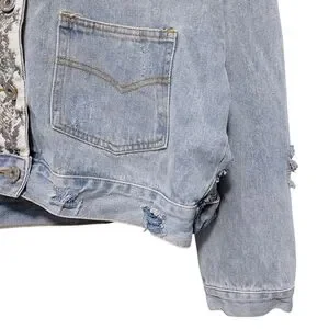 This super cute POL jean jacket is in great pre-loved condition! It is a beautiful light Wash distressed denim with snakeskin patterned patches.