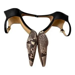 Coach Seline pumps in black leather and snakeskin print. Pointed toe, ankle strap with gold buckle and padlock detail, 3.5” heel. Elegant d’Orsay silhouette that’s perfect for career, evening, or holiday occasions.