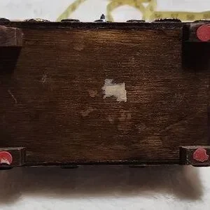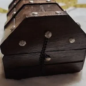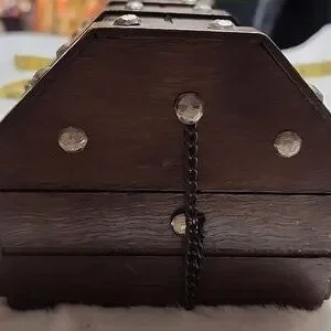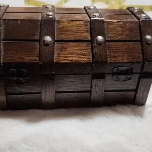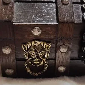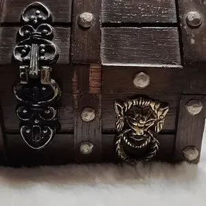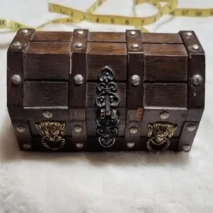 Decorative wooden pirate treasure chest with metal accents. Features intricate lion head details and a central latch. Includes lock & key ๐. Solid wood with beautiful red lining inside . has a pull out tray for area underneath for jewelry. includes lock ๐ and key for your treasures.