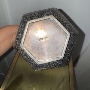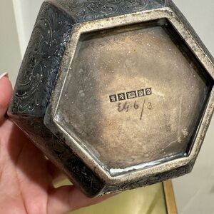 Repousse and engraved silver-plate teapot from E. G. Webster & Son has a row of amusing figures around the middle--dancing men, a woman with a child, a man reading, etc. The remainder of the surface is covered with intricately engraved scrolls and flowers. The mark on the bottom, which is a sort of "pseudo" hallmark very similar to British silver marks, is from E G Webster & Son and dates the piece from 1886 to 1928.