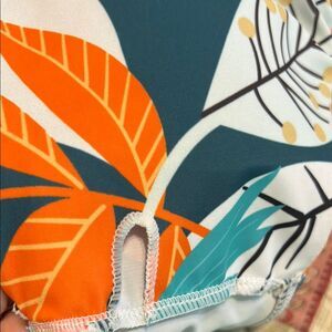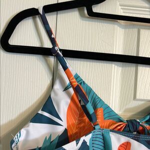 Size x-large Shein tropical floral bikini top with a vibrant leaf design. Features teal, orange, and white colors. Removable padding and knot in center front for added interest. Adjustable shoulder straps.