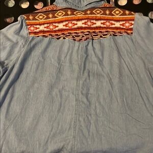 Stylish blue button down shirt. Features red patterned shoulder accents. Perfect for casual wear.