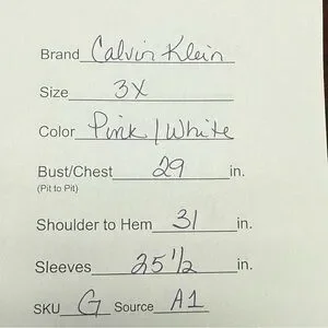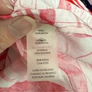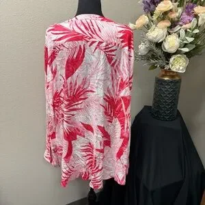Chic and breezy Calvin Klein tropical print blouse in plus size 3X. Features a vibrant coral pink and white palm leaf pattern, lightweight flowy fabric, and button-front design with flap chest pockets. Perfect for spring and summer vacations, resort wear, or cruise evenings—pairs beautifully with white pants or denim for a polished island-inspired look.