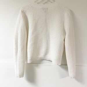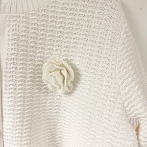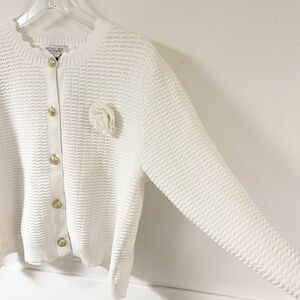 Rachel Zoe Women's white XL textured cardigan with gold buttons and flower detail on chest, cropped, boxy fit, Chanel vibes, scalloped neckline, women's size XL, cozy, preppy, old money, winter white, cropped sweater, gold hardware