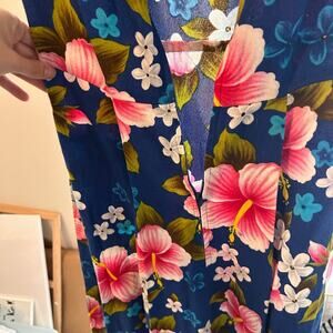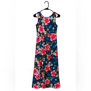 Gorgeous vintage Ui-Maikai Hawaiian dress featuring a vibrant tropical floral print on a deep navy background. Classic island style with a flattering sleeveless cut and full-length silhouette.