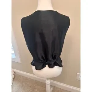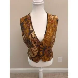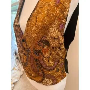 This stunning vintage batik vest features a rich brown base with intricate multicolor beaded detailing throughout. The deep V-neckline, button front, and unique patterned fabric make it a true statement piece. Perfect for layering over blouses or dresses for a bold, artistic look.