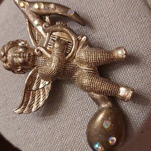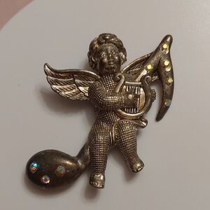 Pot metal cherub with musical clef and AB rhinestones. Unique.
