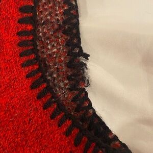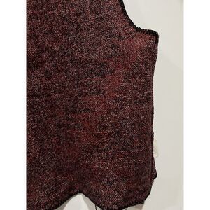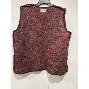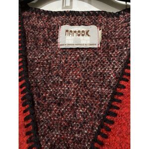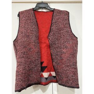 Nanook Vest crafted in Canada in size women’s large. Features earthy tones of red, grey, and black that are beautifully woven into a 100% virgin wool fabric. With a classic V-neck and a button-up front.