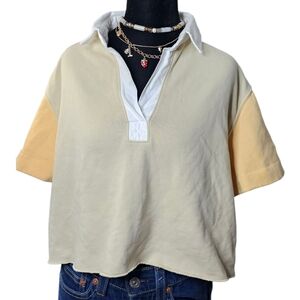 Chic short sleeve polo with a cream body and tan sleeves. Ideal for casual wear.