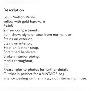 Authentic Louis Vuitton Yellow Vernis crossbody bag with embossed logo. Features a sleek design and adjustable strap. Please view all pics as they are part of the description. There is wear on the inside but the outside of bag is still n great condition for a vintage bag. Trade value $899