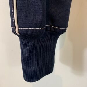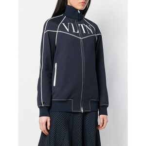+Features: Track style navy blue jacket with white trim. Zip front pockets. High ribbed neckline. Ribbed cuffs and hem. "VLTN" across front.