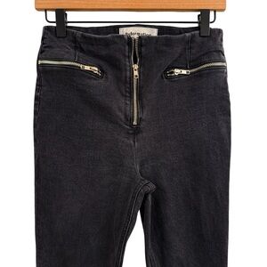Chic black jeggings with front zipper accents. High-waisted for a flattering fit. Ideal for any occasion.