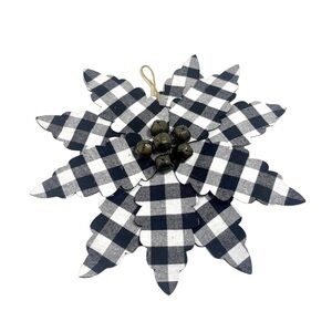 Ganz Black and White Buffalo Plaid Poinsettia Ornament with Bell Center. Super cute with jingle bells in the center.