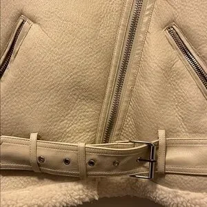Stylish cream teddy jacket. Features soft texture. Asymmetrical zipper. Belted waist. Perfect for layering.