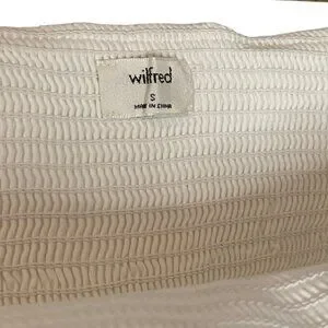 The Wilfred Bonaventure top is a strapless, cropped tube top known for its flowy, flounced silhouette and smocked lining. The top is designed as a tube top with a flounced, ruffled overlay that creates a flowy look over a fitted internal structure. It features a close fit on the body due to the smocked lining, while the top layer remains loose and airy. The style is considered versatile, often described as timeless and fashion-forward, capable of being dressed up or down.