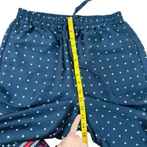 Stylish navy trousers with red and white accents. Features a drawstring waist and geometric patterns.