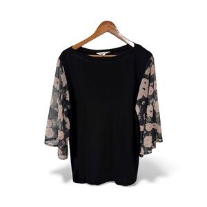 Elegant black top featuring sheer floral bell sleeves in soft blush tones. Flowy and feminine, perfect for the office, dinner dates, or special occasions. Comfortable stretch knit body with chiffon sleeves and a flattering silhouette.