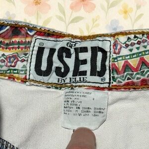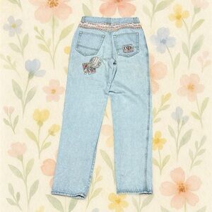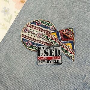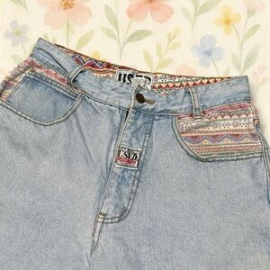 vintage jeans, 90s jeans, high waisted jeans, Used by Elie, classic jeans, aztec print denim, patterned jeans, embroidered jeans, mom jeans, retro denim, boho jeans, straight leg jeans, Hong Kong denim, Y2K jeans, vintage fashion, 90s street style, boho chic, light wash jeans, festival outfit, retro fashion