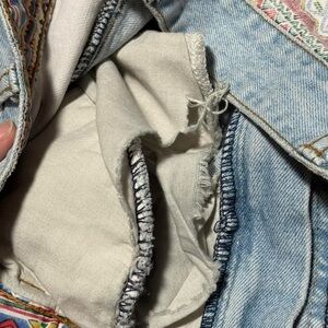 💙 Light-wash denim with colorful Aztec-inspired woven details on the waistband and pockets.
