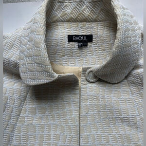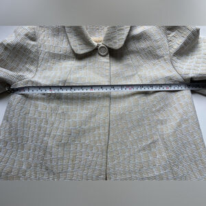 Chic cream blazer with textured design. Features a classic collar and three-quarter sleeves. Ideal for versatile styling.