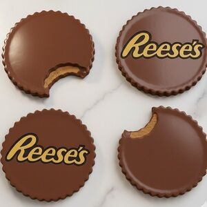 Bring a dash of chocolatey charm to your space with this Peanut Butter Cup Inspired Coaster Set! Each coaster is handcrafted to look like a classic Reese treat — two whole cups and two “bitten” ones revealing a creamy peanut butter-style filling. The perfect cozy accent for dessert lovers and handmade décor fans alike.