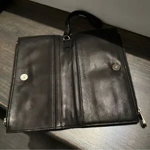 Stylish leopard print wristlet clutch. Features a sleek design with a convenient strap.
