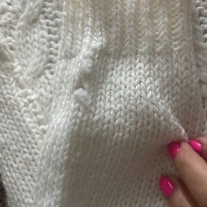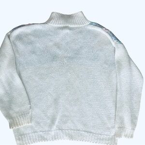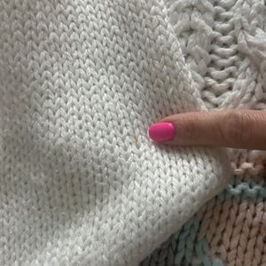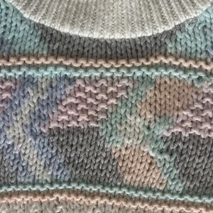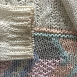 Hand knit white ramie/acrylic blend with pastel geometric pattern across the front