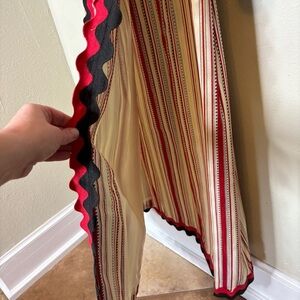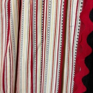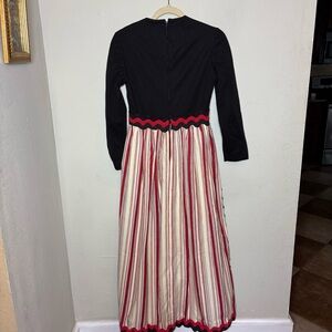 This sophisticated dress features a black crew neck top with long sleeves, seamlessly transitioning into a pleated A-line skirt adorned with red and white stripes. It offers a flattering silhouette with its defined waistline and flowing skirt. This piece is handmade and is most likely from the 1960s based on fabric and style. It is in excellent used condition and is a real treasure of a find.