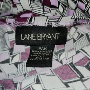 Pre-owned Lane Bryant women's top, size 18/20. Fabric content: 90% polyester, 10% spandex. Made in Taiwan. Features a V-neck, three-quarter sleeves, and a wrap-style design with a self-tie belt. The top is adorned with an abstract geometric print in shades of purple, gray, and white. The item shows no visible signs of damage or wear, but it is pre-owned.