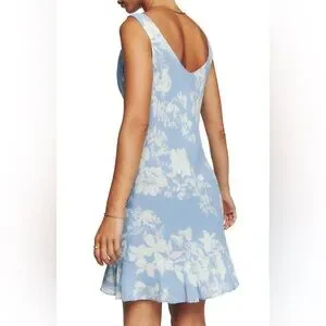 The Rudie dress is a draped, crepe mini dress with an elegant cowl neck and lightly ruffled hem… this one coming in an elegant, almost Victorian styled blue and white floral-print.