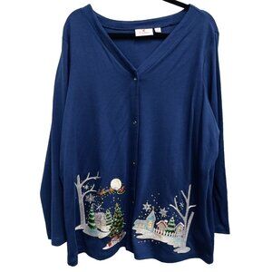 Quacker Factory Womens Christmas Cardigan Sz 1X Blue Embroidered Wearable Art