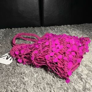 Bucket handbag with beaded fabric exterior. Fabric interior bag. Handles. Drawstring closure. *Brand new with tags. Authentic brand