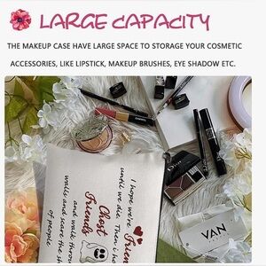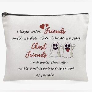 White pouch with ghost friends design. Features playful text and ghost graphics.