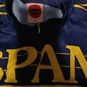 Bold cycling jersey featuring SPAM and Crazy Tasty graphics. Eye-catching yellow and blue design with a burger print.