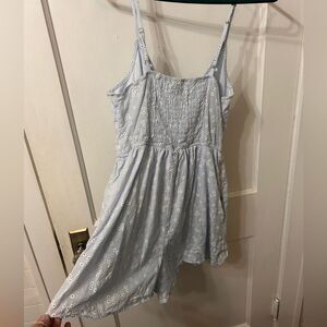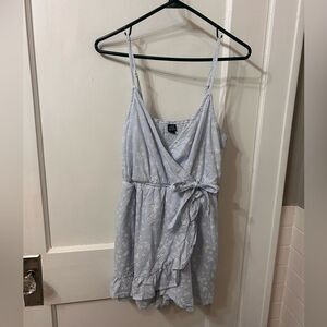 Stylish blue romper with floral design. Perfect for casual outings. Shorts underneath and pockets