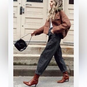 Lovely brown plaid jacket with stand collar, pockets, snap and button details. Inspo photo from Pinterest. Tagged size large, fits me perfectly slightly oversized as a medium. I am 5’8 for reference and had plenty of room for a sweater layer underneath.