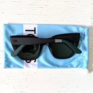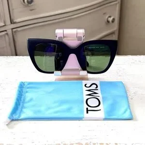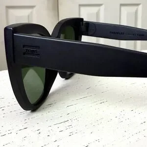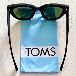Not to be outdone, the oversized and slightly cat eye frames and squared lenses of the Sydney are perfect for looking glam poolside. Bold matte frames are made of SOLAFLEX™ plastic for pliability and durability. These glasses have a rubberized finish for a soft-to-the-touch, feature signature TOMS stripes, and are fitted with olive-fade, 100% UVA & UVB protection lenses. These have been gently worn and well cared for. They are in excellent condition with no scratches and come with TOMS drawstring case.