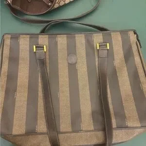 Elegant Fendi tote with brown and tan stripes. Features iconic logo and spacious design. Bought in the 80s. Used like new. No marks or tears of any kind. Inside is also like new.