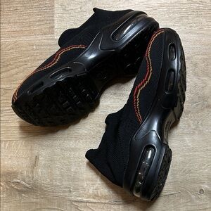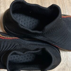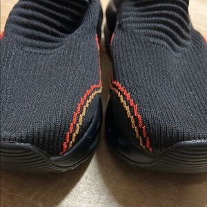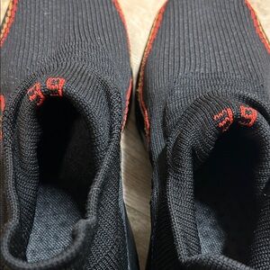 Stylish black knit slip-on sneakers with red accents. Comfortable and trendy design. No brand name noted. Made in china. Size EU 39 (8 women’s US)