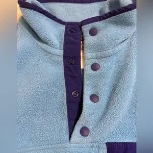 Soft fleece jacket by Patagonia. Features a snap-up collar and a purple chest pocket.