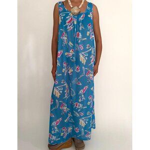 this is a lovely vintage semi sheer maxi dress “made in the u.s.a.” from the 70s featuring a multicolor abstract print on a blue background – it is such a statement piece, and the colours remain so lovely and bright despite its age! the sleeveless dress features wide straps, a scoop neckline, and a full maxi length (shown on 5’6 model who is wearing platform wedges). the dress slips over the head with no closure, and the fabric feels like a lightweight, semi sheer polyester that is unlined. the fit is super floaty and airy, making this dress perfect to wear as a summer beach cover up, or layered over a slip dress to a nice dinner on vacation!