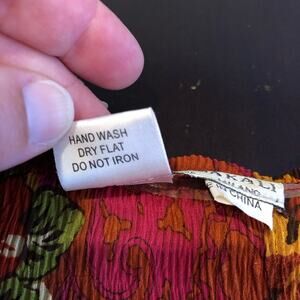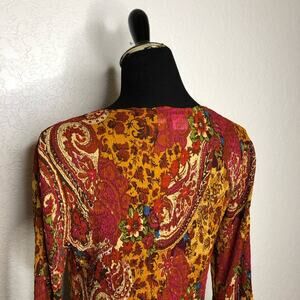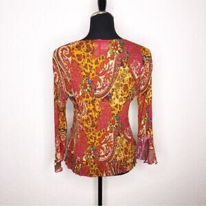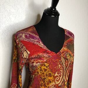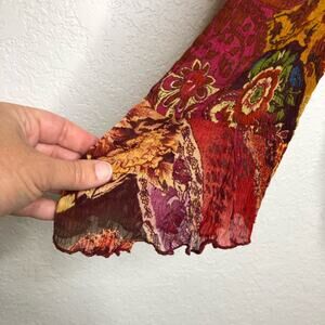 Alberto Makali red gold mixed floral print sequin crinkle top. Pullover style with v neckline. Layered hemline. Flared sleeves. Midlength sleeves. Sequins on front. Size Large. Excellent preowned condition. Minor wash wear.