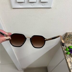 Elegant sunglasses with a black frame and gold accents. Perfect for a sophisticated look.