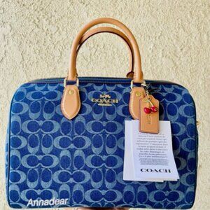 Brand new with tag and gift receipt. COLOR: denim/Gold/Den Gold/Natural Brand new with tag and gift receipt. Style Number CY699 Measurements Length: 11.75" Height: 8.25" Width: 7.0" Materials Signature denim and vachetta leather Fabric lining Handle Handle with 4.5" drop Strap Detachable strap with 20" drop for shoulder or crossbody wear Features Outside zip pocket Inside snap and zip pockets Zip closure