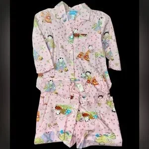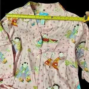Includes button-front long sleeve top and matching pants in a soft pink background with tiny floral details and Geisha print — feminine, unique, and highly collectible.
