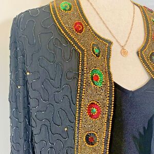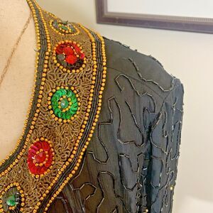 Vintage Evening Jacket XL Lawrence Kazar 100% Silk Beaded Black Gold Retro 90’s