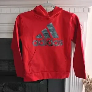Adidas size small/8 red hoodie/hooded sweatshirt with grey logo. 58% Cotton/42% Polyester. Play condition for wash wear/pilling, a couple picks, and a few spots. MSRP- likely $40 but I couldn't find this exact one.