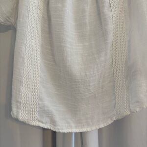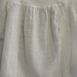 Lightweight and airy white gauze blouse by Lucky Brand. Features beautiful crochet trim detailing around the square neckline and vertical front seams. Made from a soft cotton-modal blend that drapes effortlessly and feels breathable. Short flutter sleeves and a relaxed silhouette.