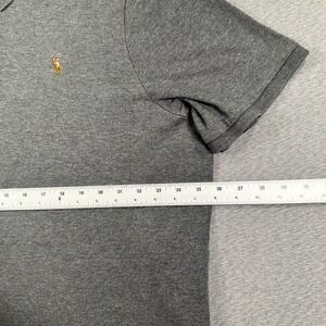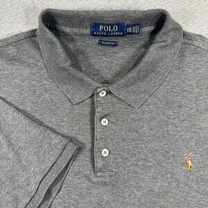This Polo Ralph Lauren shirt for men in size 2XL features a classic fit with a collared neckline and pullover closure. Made from 100% cotton knitted fabric in a solid gray color, it is suitable for various occasions including travel, parties, casual wear, workwear, and business meetings. The shirt is adorned with embroidered logo accents and is designed for comfort and breathability, making it a versatile and stylish addition to any wardrobe.