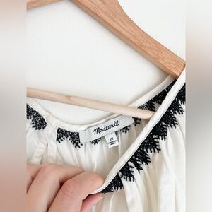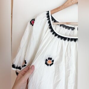 Excellent gently used condition - no flaws. Gorgeous flutter sleeve top from Madewell. Style name is “The Nancy Top”. White with black trim on collar and sleeves. Yellow and red embroidered flowers all over.